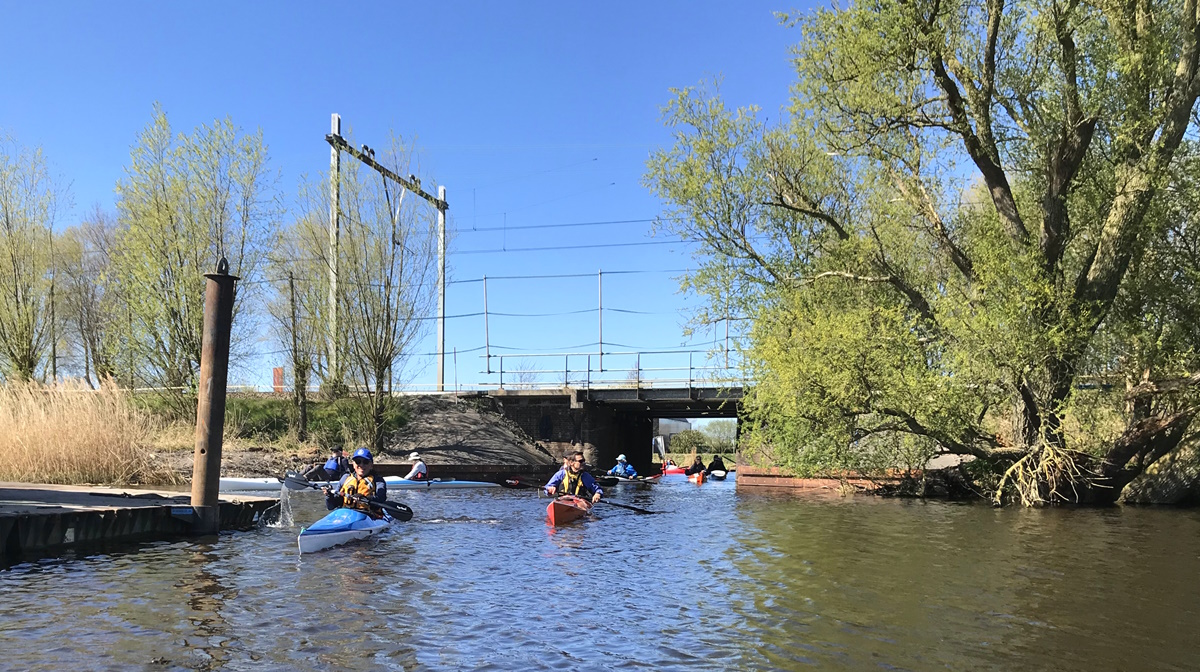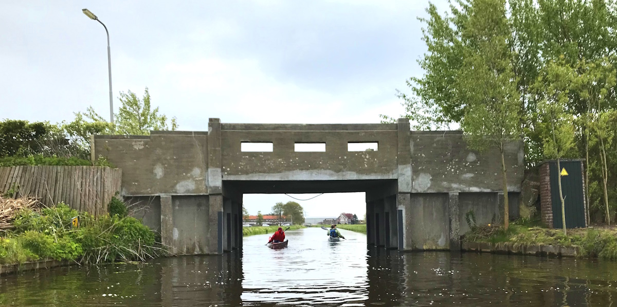 2: Ga hier linksaf. Onder twee bruggen door. Kort hierna zie je rechts de kanosteiger van het startpunt (punt 1).