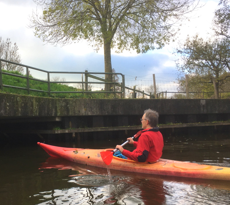 Wij zijn aan de zuidkant van het aquaduct naar boven geklommen. Dat leek iets makkelijker. Maar bovenop het aquaduct aangekomen blijkt dat je vanaf de zuidkant door een privé-tuin moet of over het hek van een klein gemaal moet klimmen om in de Lopiker Wetering te komen. Vanaf de noordkant kun je makkelijker het water van de Lopiker Wetering in.
