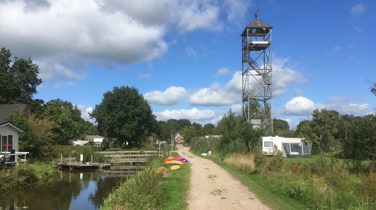 Op de camping staat een uitkijktoren die al van verre te zien is.