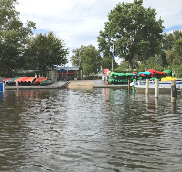 De kano's en kajaks liggen klaar in het haventje van camping en jachthaven Kleine Belterwijde |