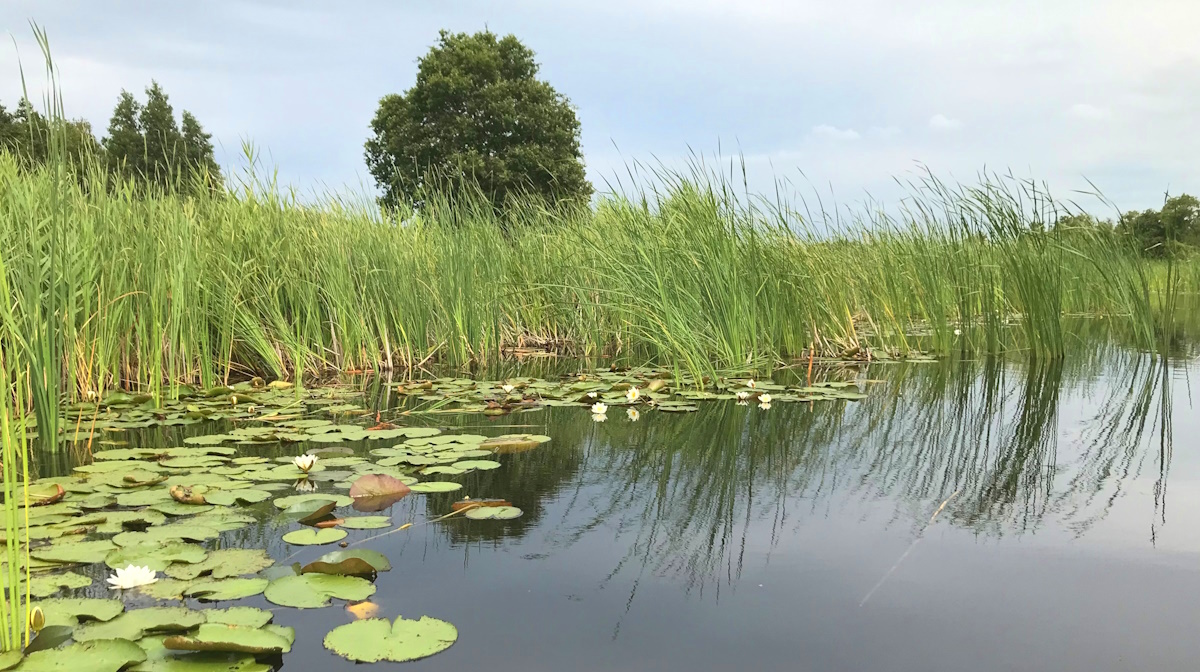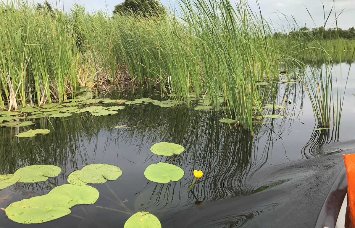 Het gras is veenmoeras en lijkt te groeien in en op het water.