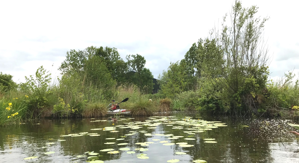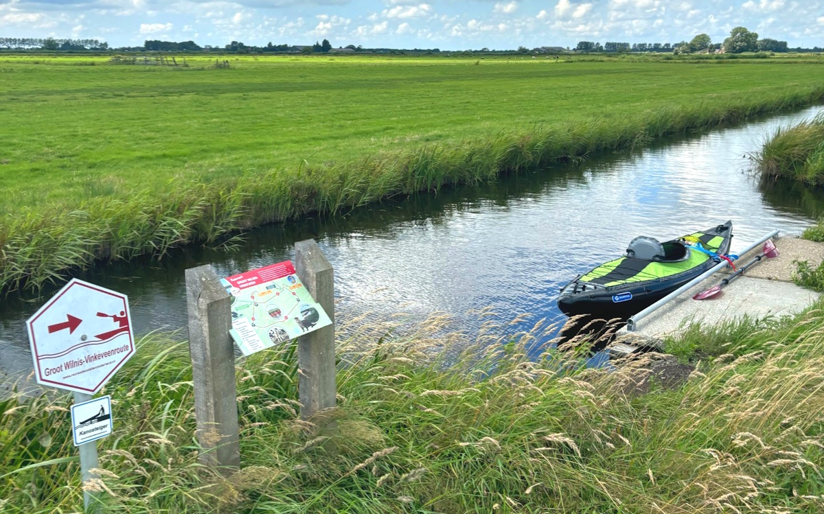 E: Ga hier het water uit en loop de laatste meters naar het paviljoen voor een heerlijke pauze! Vanaf hier vaar je weer terug naar punt D. Ga dan linksaf en vervolg de Veldwetering tot aan een breed kanaal. Dat is de Bijleveld op punt F. F: (Als je hier rechtsaf gaat en op het einde overdraagt, dan kom je op de Gagelroute.) Kruis de Bijleveld en vervolg je weg over de Veldwetering. Ga onder de provinciale weg door, en ga verder tot het einde. Nu ben je bij punt G. G: Ga uit het water en draag over naar de Heinoomsvaart. Ga rechtsaf en terug naar het startpunt (dus: rechtsaf, met de bocht naar links, onder de brug door en 2x rechtsaf.)